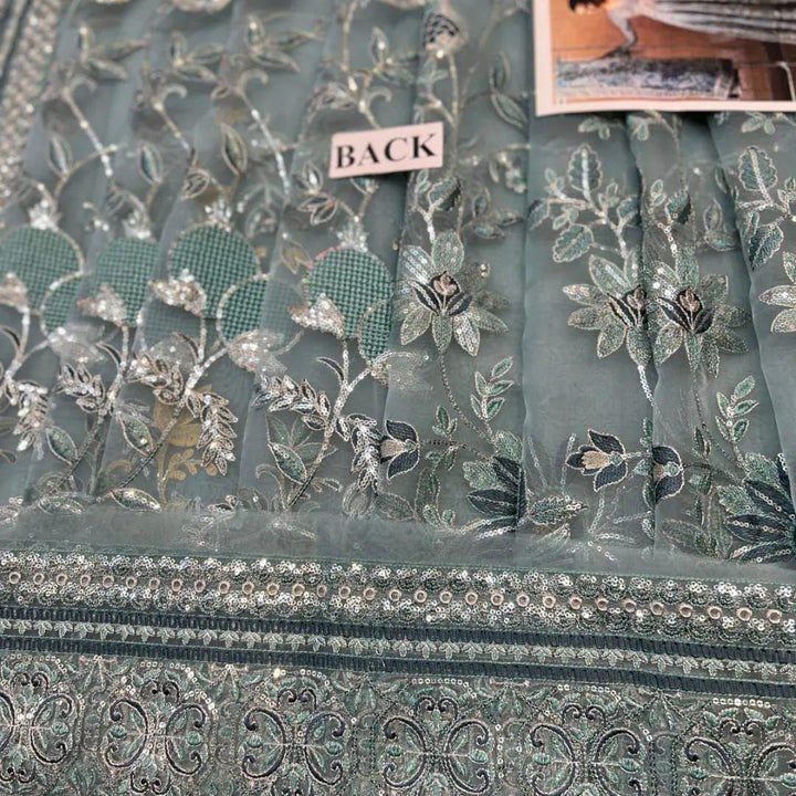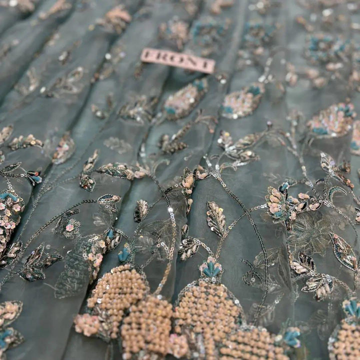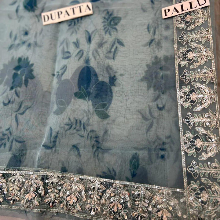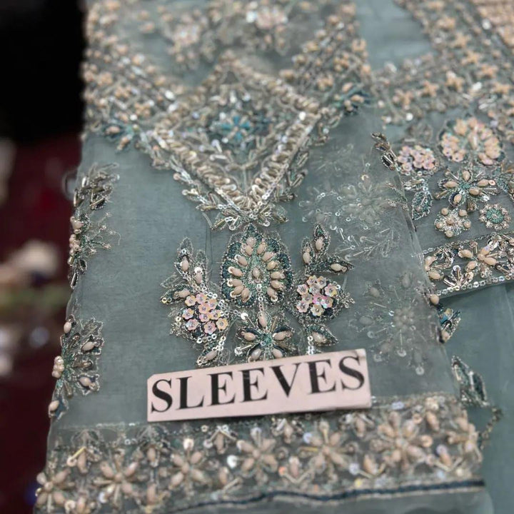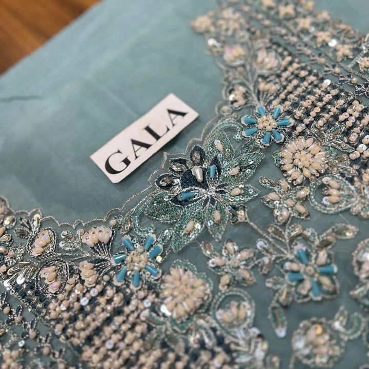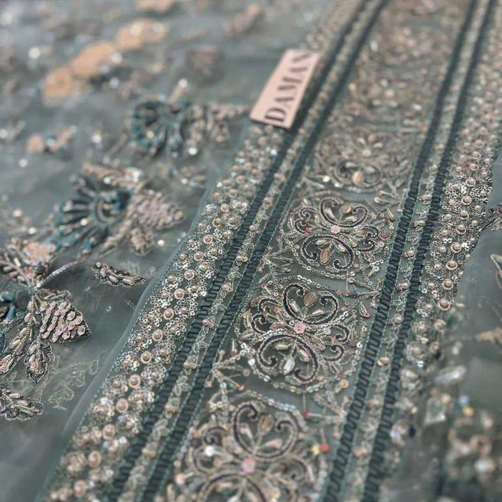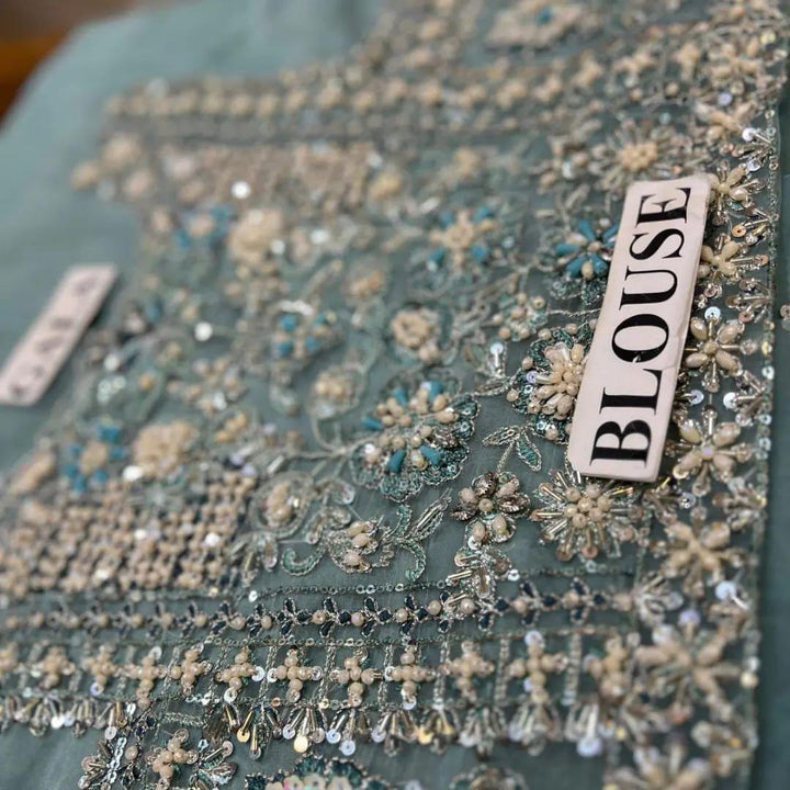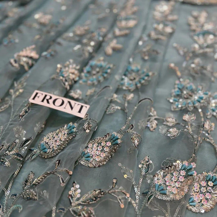 A dainty Ice-Blue silhouette, lavishly adorned with intricate embellishments on the front and back bodice, creates an alluring look. The opulent peshwas showcase heavy embellished borders, evoking a regal charm fit for royalty. Accompanying this divine piece is the resplendent silk crushed sharara, draping gracefully and exuding a fairy-tale like aura. Completing this enchanting ensemble is the digital printed dupatta, featuring celestial motifs in mesmerizing hues. Its four sided embellished border exudes an aura of ethereal elegance.
