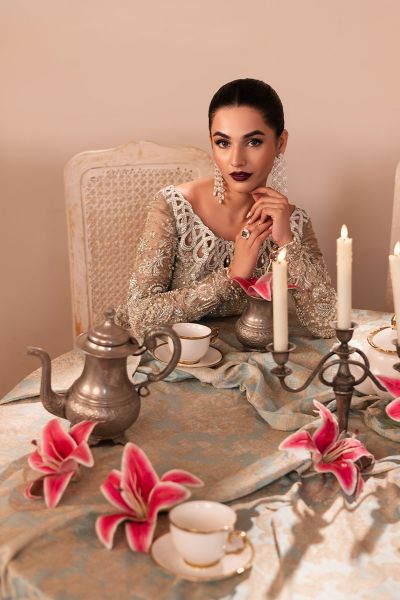 The "Aurora" dress exudes elegance with its intricate embroidery and delicate detailing. The long, flowing silhouette is adorned with sparkling beadwork, creating a luxurious look perfect for special occasions. The neckline features a unique cut-out design, adding a modern twist to the traditional ensemble. Paired with a sheer dupatta that complements the dress's ornate embroidery, the overall look is timeless and sophisticated, ideal for weddings or formal events.