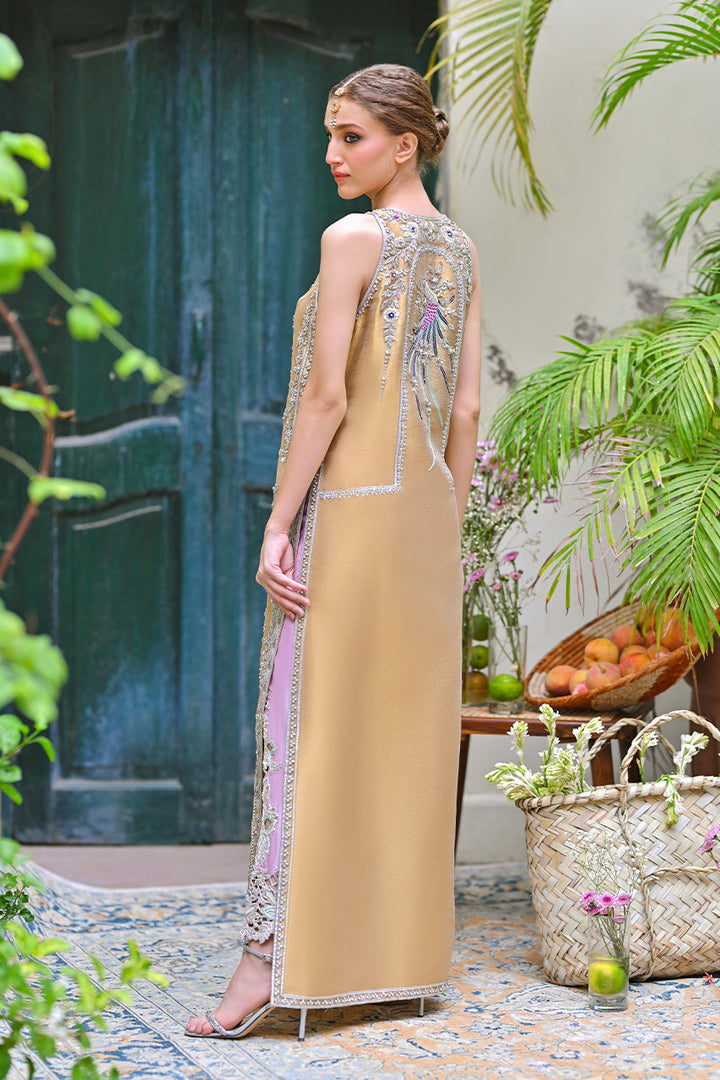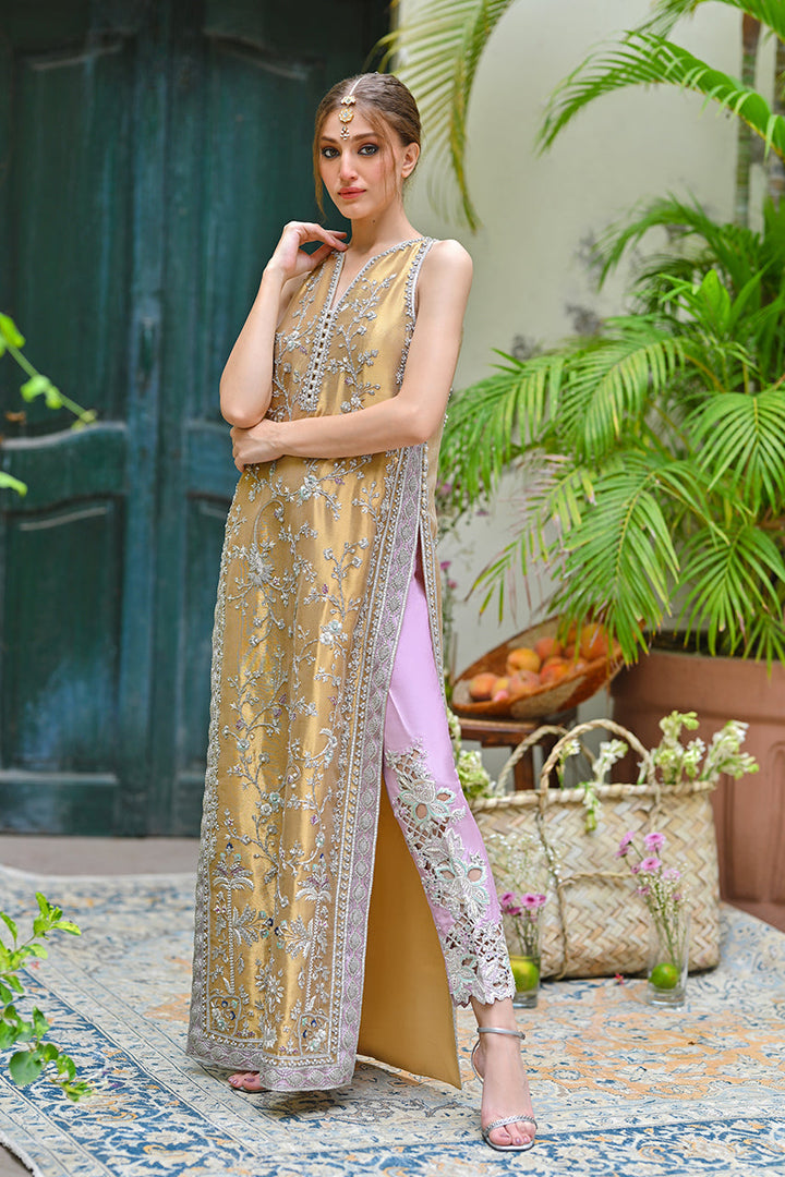 A meticulously crafted golden tissue shirt with zardoze detailing in hints of turquoise and lilac is the ideal option for your summertime festivities. It comes with a pair of lilac rawsilk pants that feature intricate cutwork details.