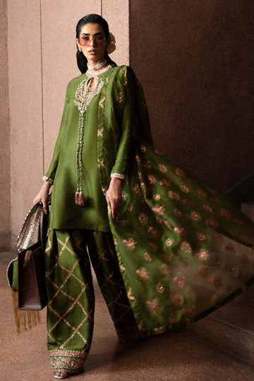 A regal olive green ensemble including a beautiful short raw silk shirt with embellishment detailing on neckline. The neckline is also adorned with gold sequins and naqshi with green, gold and pink buggle beads. It is paired with heavily embroidered and embellished shalwar. It comes with printed organza dupatta with block printed finishing on all four sides.
