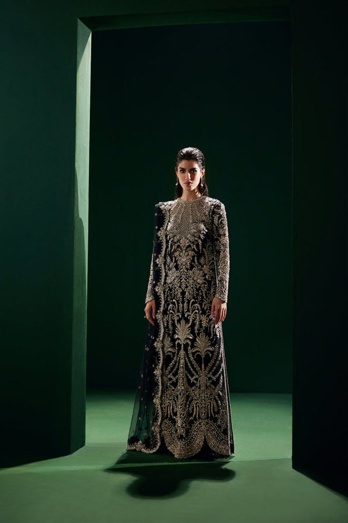 Éclat is a sleek black mock-neck net shirt, adorned with delicate chandi embellishments that gracefully flow across the front and back. It is paired with flared trousers featuring intricate scalloped cutwork, and a matching opulent dupatta.