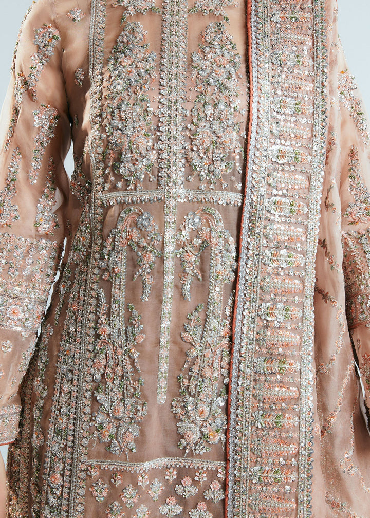Step into luxury with this stunning peach-colored bridal ensemble, intricately adorned with silver hand-embroidery and delicate embellishments. This regal outfit features a flowy silhouette with wide-legged pants and a richly detailed dupatta, perfect for a bride who wishes to combine tradition with modern elegance.
