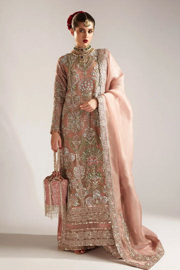 This regal outfit rendered in a beautiful shade of Pink on an organza canvas for shirt and Raw-silk palazzo, with heavy embellished motifs along with intricate details. The timeless look is completed with an organza dupatta along with four side heavy embellished borders with 3 different corner motifs embellished with sequins, cut dana and with nakashi, dabka concluding the look marvelously.
