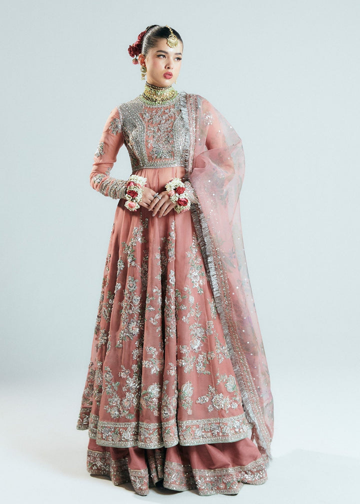 Embrace timeless elegance with the Rosette Reverie Peshwas, crafted from luxurious blush organza and adorned with intricate silver dabka, naqshi, and sequin work. Paired with a premium Korean raw silk sharara featuring a beautifully embellished border, this ensemble is completed with a digitally printed organza dupatta, enhanced with foil print and a delicately adorned border. Each element is thoughtfully designed, making this outfit a perfect choice for any formal occasion.