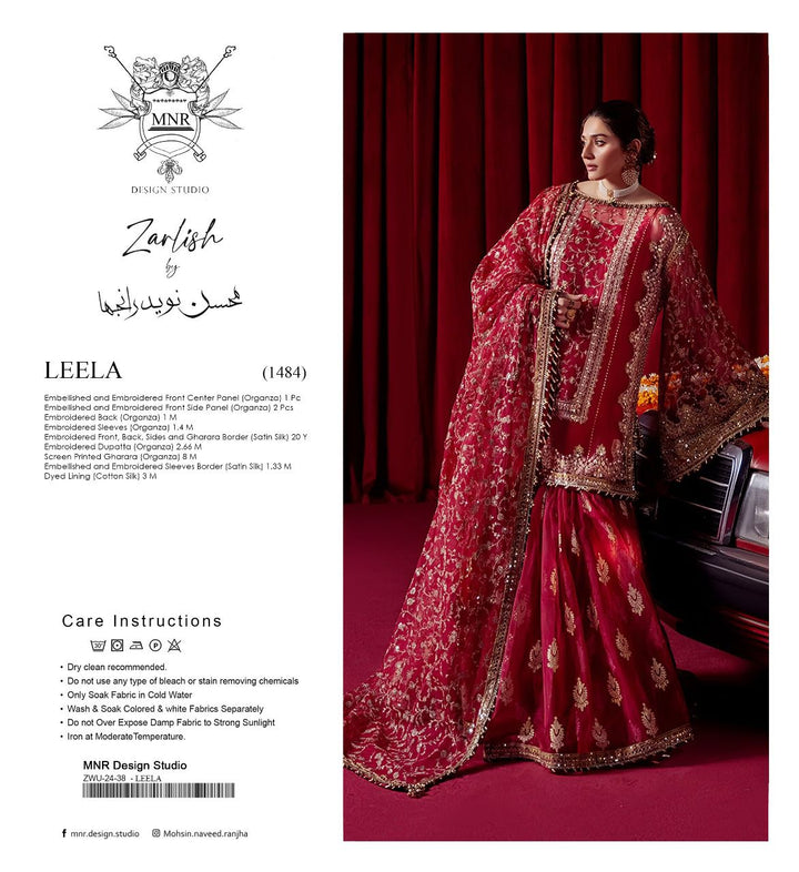 Step into the enchanting world of "Leela" from MNR’s Dur-e-Nayab 2024 unstitched collection. This pomegranate red organza ensemble radiates vibrancy with its intricate thread and tilla embroidery, shimmering sequins, and delicate panni details. Hand-applied pearls add a luminous touch, making each movement dazzle. The organza gharara pants feature a silver-gold foil print and detailed hem, perfectly complementing the rich red hue. Paired with a matching organza dupatta adorned with embroidery and a four-sided border, "Leela" is a true celebration of elegance.