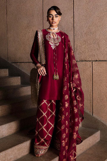 A ravishing burgundy maroon ensemble including a beautiful short raw silk shirt with embellishment detailing on neckline. The neckline is also adorned with gold sequins and naqshi with green , gold and pink buggle beads. It is paired with heavily embroidered and embellished shalwar. It comes with printed organza dupatta with block printed finishing on all four sides.