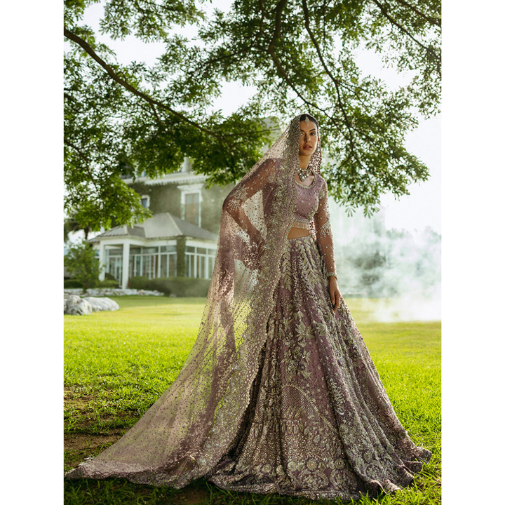 A stunning purple lehenga choli adorned with intricate dabka, naqshi, pearls, and Swarovski crystals, creating a radiant bridal look. The net lehenga features a delicate spray of thread and sequins, adding a soft shimmer to every step.