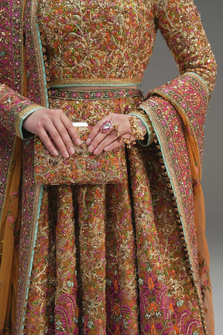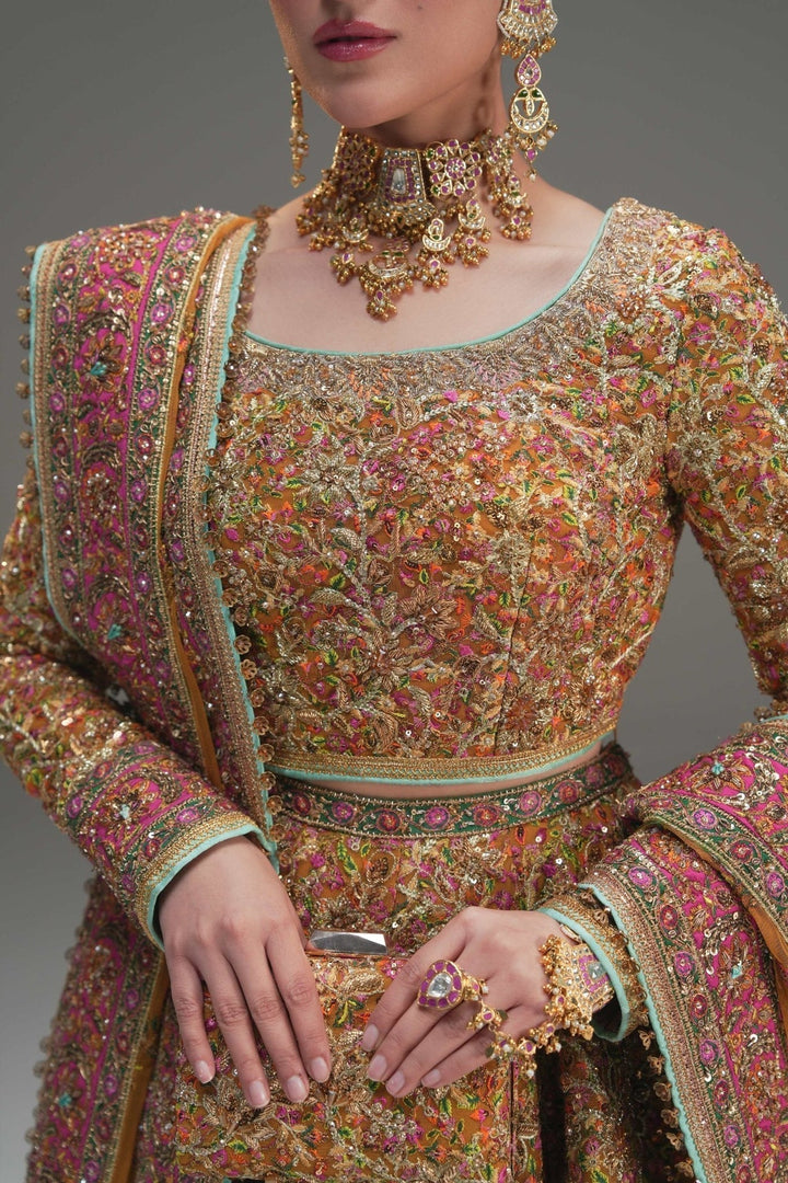 A timeless tale of grace and grandeur, woven into every thread. Inspired by the allure of tradition, Naugul is a meticulously designed yellow net lehenga choli, paired with a structured corset and adorned with intricate embroidery and handwork embellishments. The ethereal net dupatta, featuring a beautifully embellished border.
