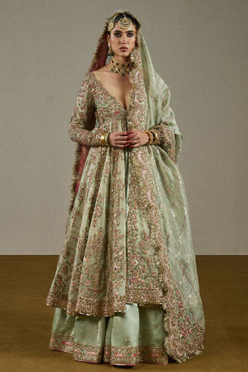 Step into elegance with our stunning tea green pure organza pishwaz, featuring a front-open design and lavish hand embellishments. The deep V neckline adds allure, perfectly complemented by a luxurious satin silk lehnga adorned with a delicate hand-embellished spray. Complete the look with the enchanting pure organza dupatta, finished with gold tissue and dazzling kiran detailing. This ensemble embodies timeless beauty and sophistication!