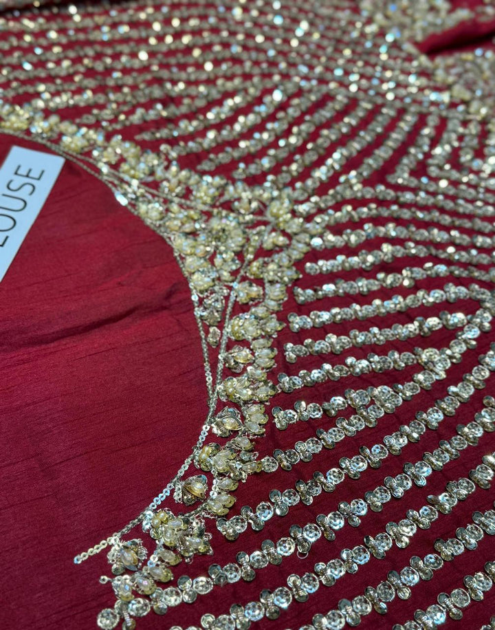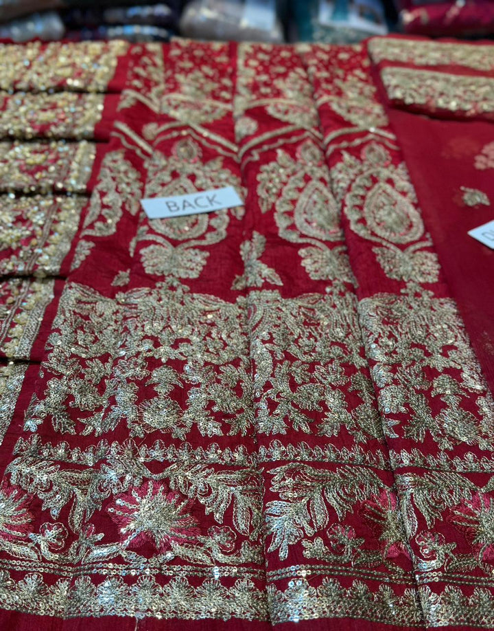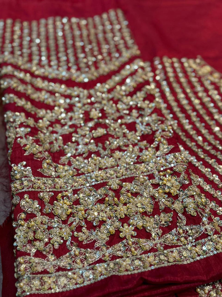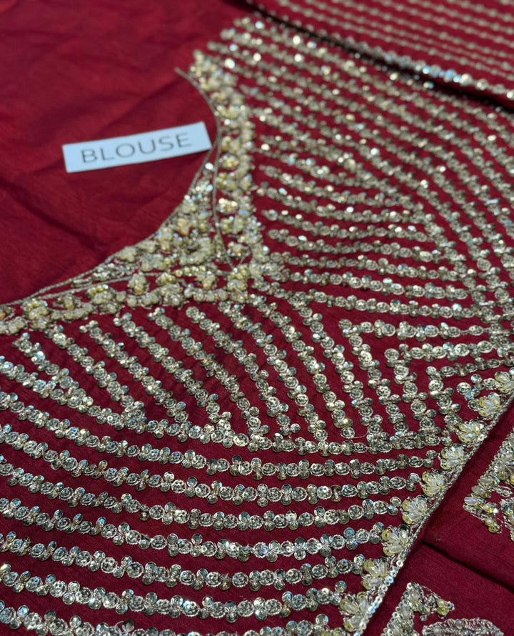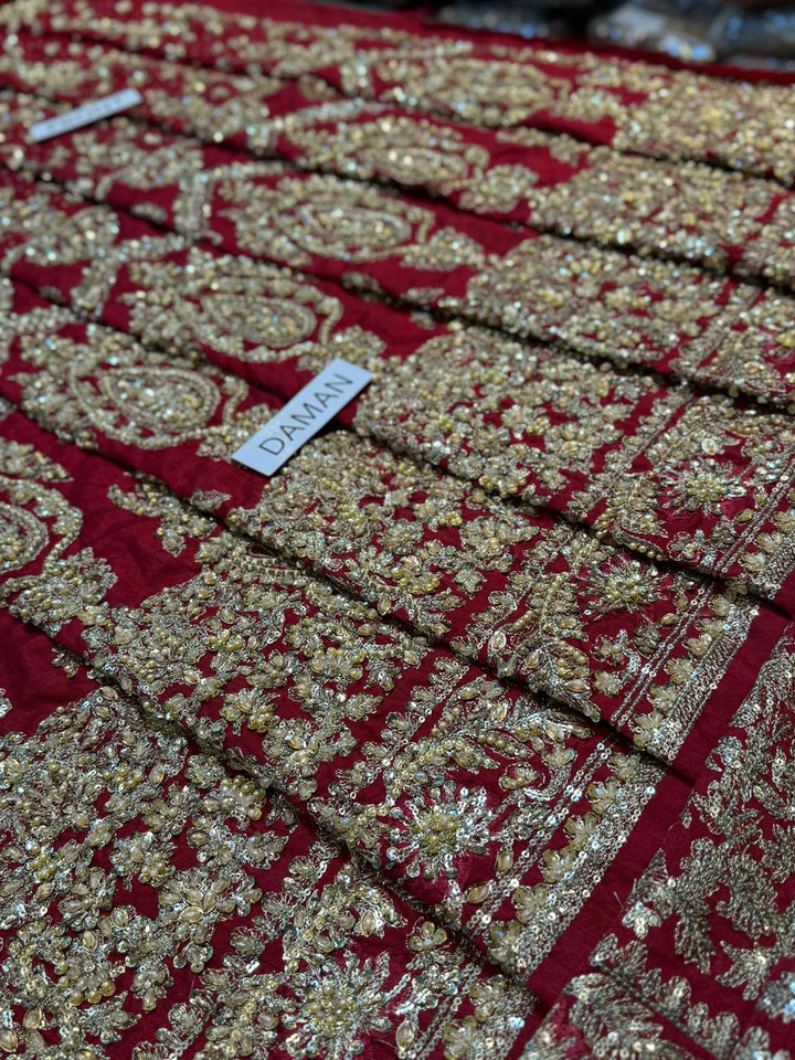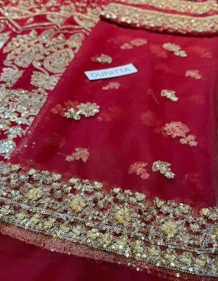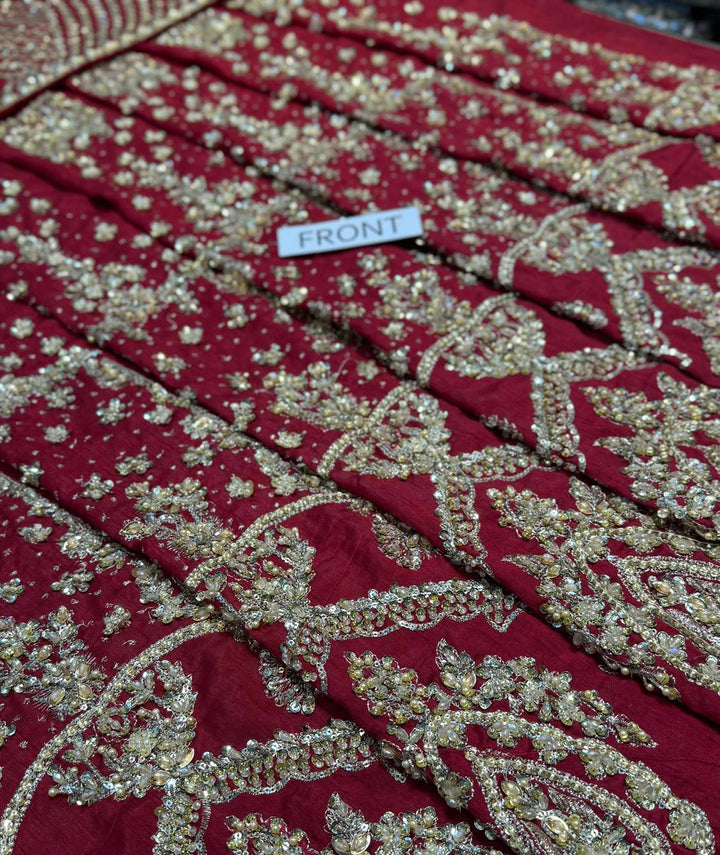 Channeling exuberance and grandeur, Raeni encapsulates the regality of a classic red bridal. The set showcases bedecked motifs gleaned from Mughal inlay art wrought using dabka, naqshi, crystals and pearls. The booti jaal choli greatly accentuates the look due to its contrasting linear pattern. Edging its tulle dupatta are two borders and a gorgeous kiran lace. True to the FS couture aesthetic this bridal set exhibits the ultimate ageless opulence.