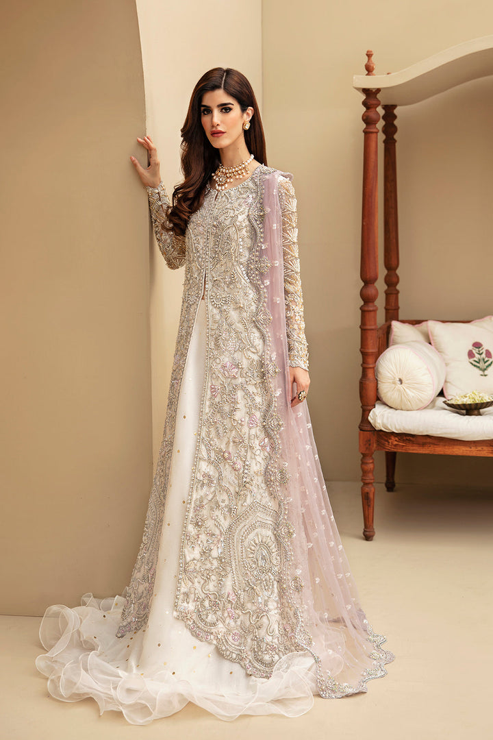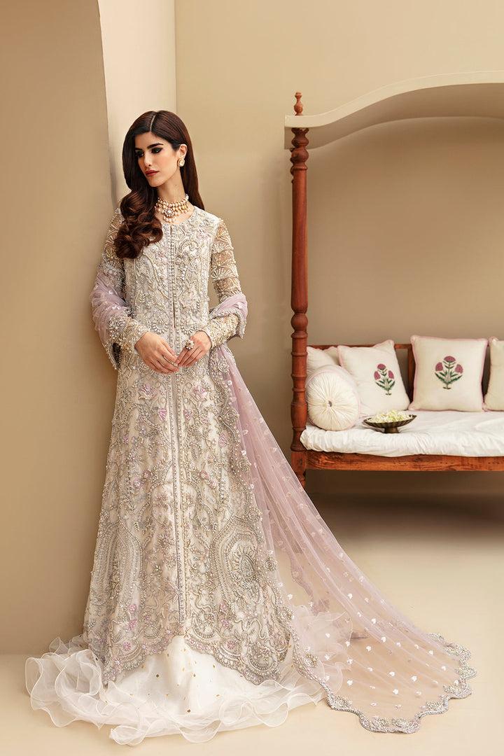 Elevate your elegance with the timeless grace of the "Sophea" ensemble. This exquisite outfit features intricate embroidery, delicately woven into luxurious fabric that captures the essence of sophistication. The subtle blend of soft lavender and silver hues, adorned with sparkling embellishments, creates a mesmerizing look perfect for weddings or special occasions. The long, flowing silhouette is complemented by a sheer dupatta, adding a touch of ethereal charm to your attire. Pair it with classic jewelry to complete the look and make a statement at any event.