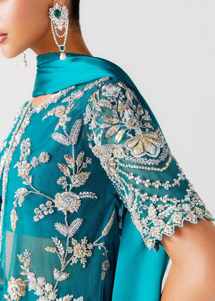 Zumrud Ayin is a ritual of reinvention where tradition collides with couture. A pant-saree draped in luminous turquoise green satin cascades in sculptural folds, creating movement that is both commanding and effortless. The open-front jacket, detailed with silver botanical embroidery and crystal accents, frames the silhouette with regal precision, while the matching embellished potli completes the ensemble with ceremonial intent.